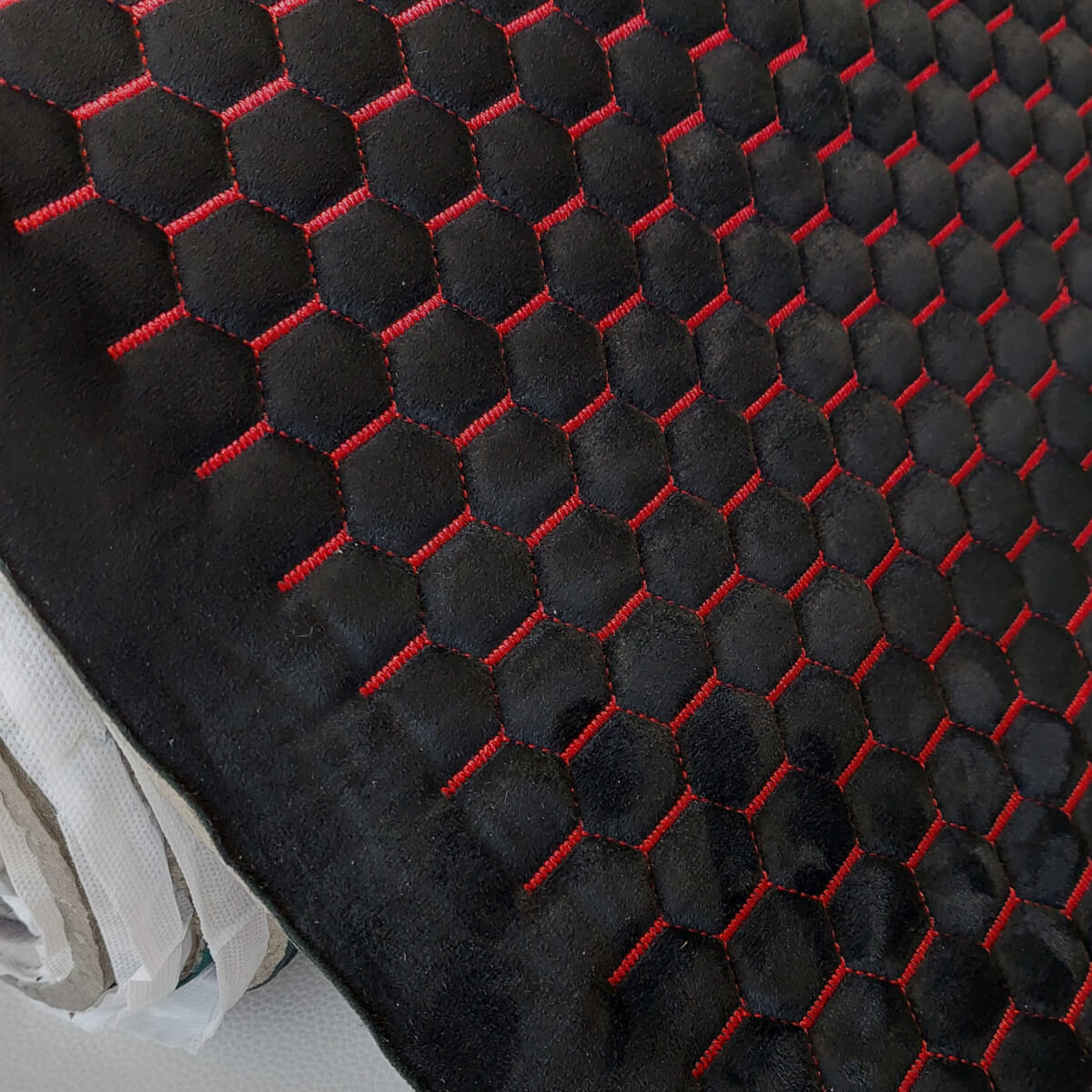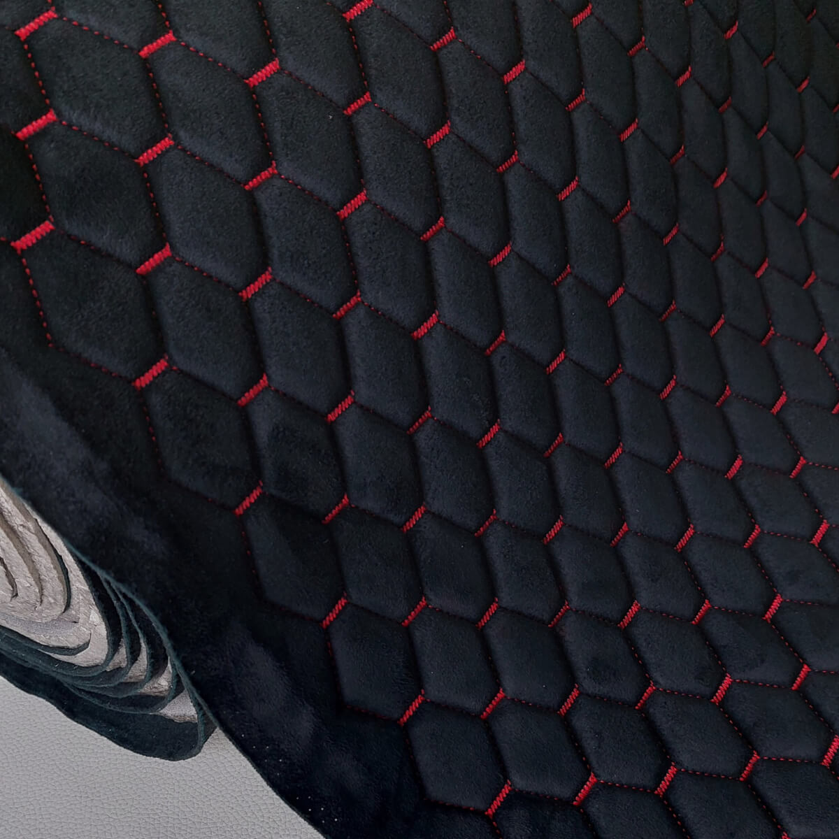 • Quilted material with red thread for car seat with foam, “Velour/Alcantara” imitation, Black
