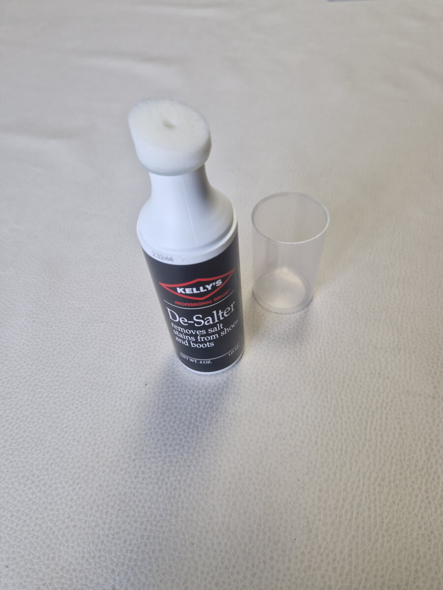 It is now very easy to remove snow and salt stains from your shoes and boots with Kelly’s De-Salter.