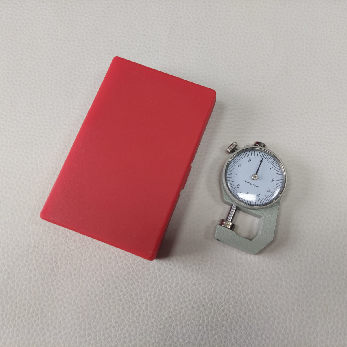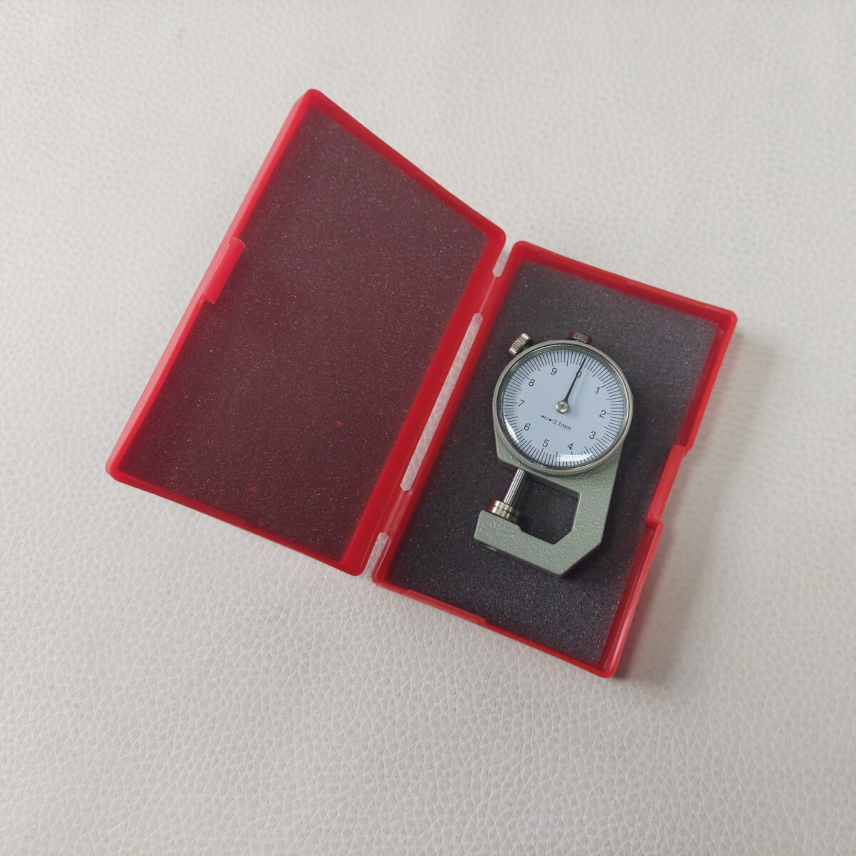 Kompaktiškas, nedidelis odos storio matuoklis su dėklu.